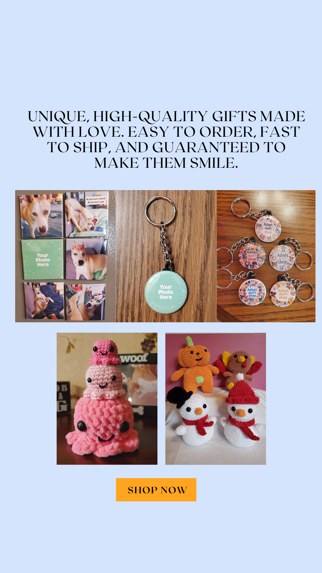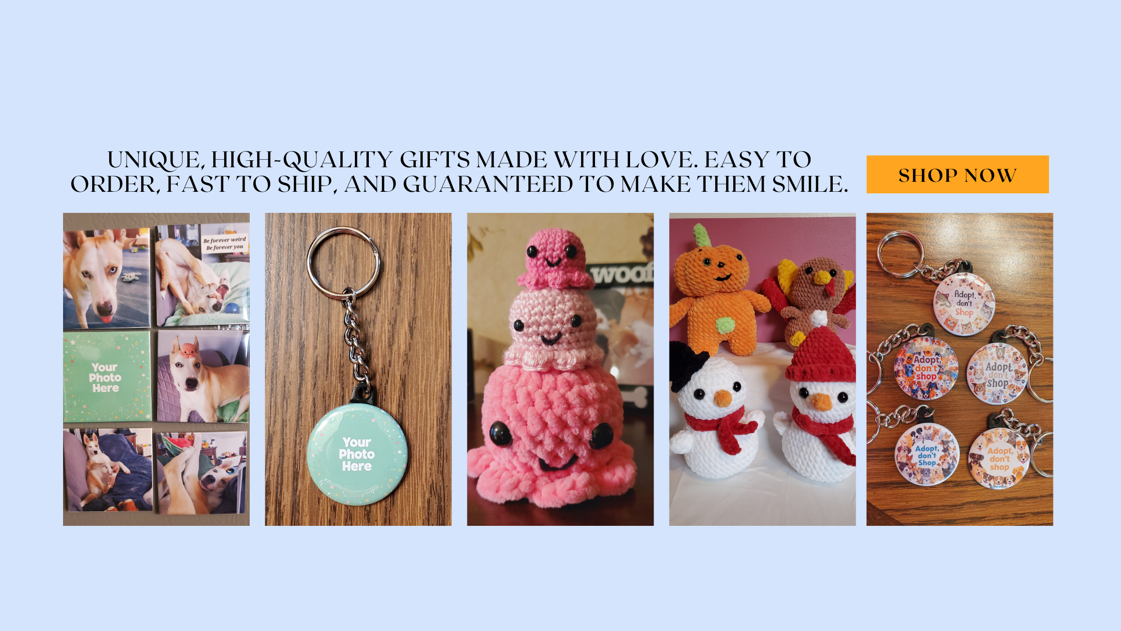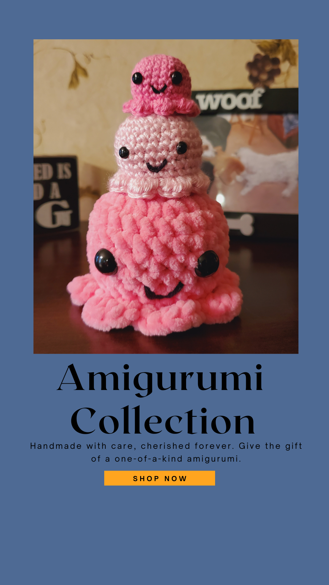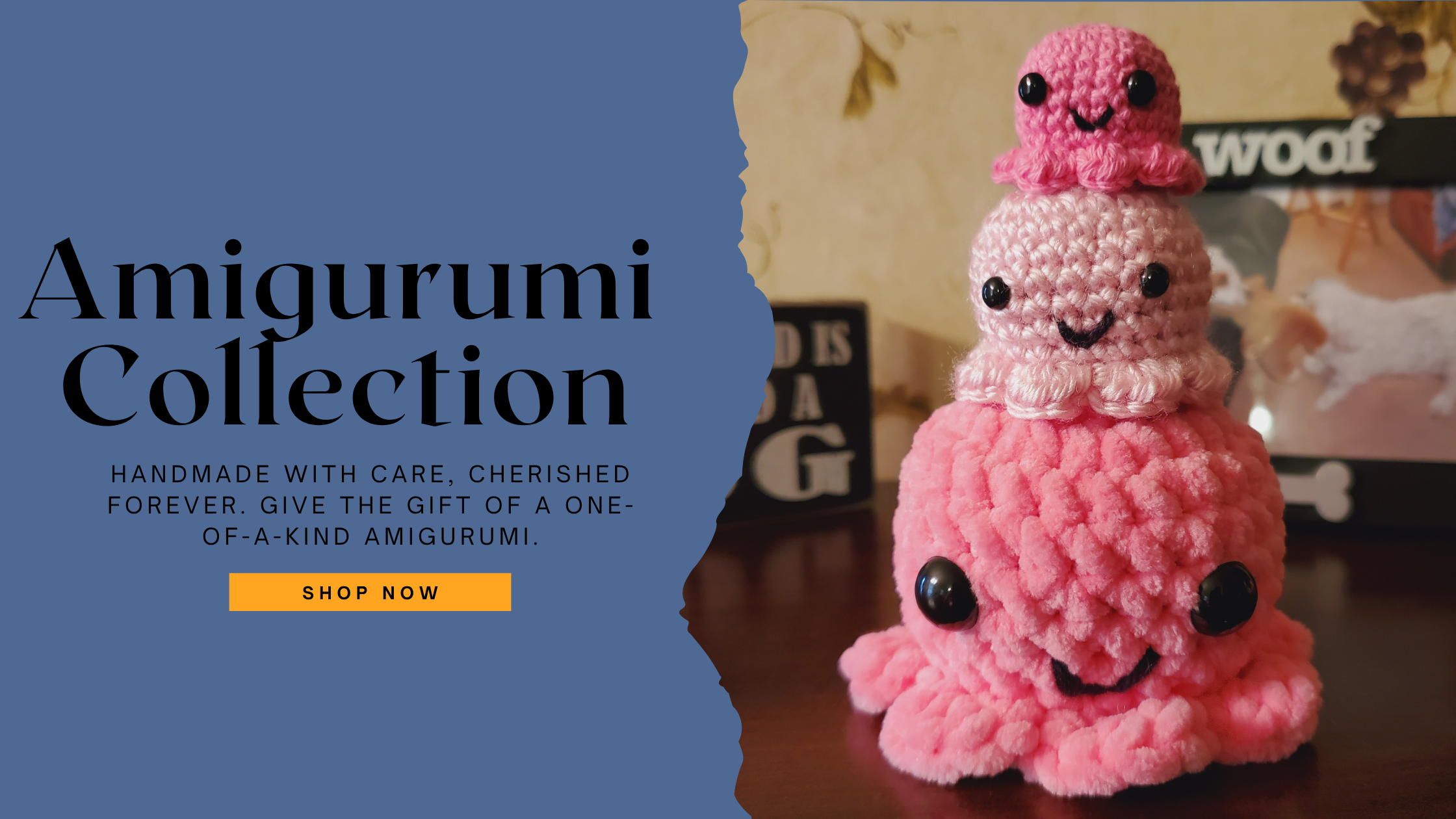 Handmade with care, cherished forever. Give the gift of a one-of-a-kind amigurumi. Design changes monthly. Supplies are limited, get them while they last!